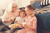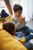Radosna kobieta przynosi dzieciom dwie szklanki soku