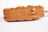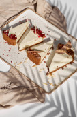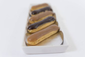 Francuskie eklerki deserowe lub profiterole z białą polewą czekoladową. Wyroby cukiernicze na słodycze.