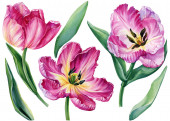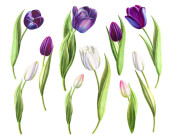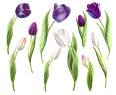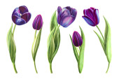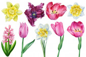 Zestaw kolorowych kwiatów tropikalnych callas i liści. Akwarelowe malowanie botaniczne na białym tle