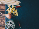 Makaron z różnych krajów. Soba, Udon, spaghetti, zabawa wybrana. Czarne tło, płaski układ, przestrzeń do kopiowania. Kontekst żywności.