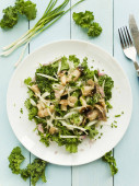 Pieczarki ostrygowe z nasionami sezamu, rzodkiewką i sałatą na talerzu. Pleurotus eryngii.