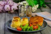 Schab z grilla z cebulą i pieczarkami, podawany z tłuczonymi ziemniakami.
