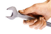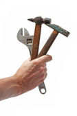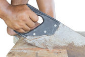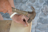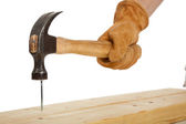 stolarz jest uderzanie paznokci na głowę z stare i używane drewno izolat biały