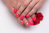 Zdjęcie "Letnia czerwień, manicure koralowy ze złotą folią na krótkich owalnych paznokciach " może być wykorzystywane do celów osobistych i komercyjnych zgodnie z warunkami zakupionej licencji Royalty-free. Obraz jest dostępny do pobrania w jakości wysokiej rozdzielczości do 5760x3840.
