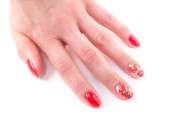 Letnia czerwień, manicure koralowy ze złotą folią na krótkich owalnych paznokciach