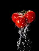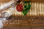 pomidory wiśniowe na niebieskim drewnie widok z góry. z miejscem na tekst.
