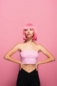 szczęśliwa młoda kobieta z kolorowymi włosami patrząc daleko odizolowany na różowy
