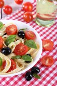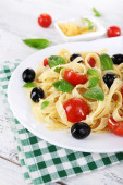 spaghetti z pomidorami, oliwkami i liści bazylii
