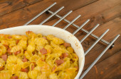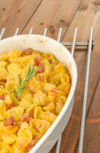 domowy makaron zapiekany z porów, boczek i krem