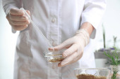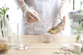 Kobieta w rękawiczkach wypełniających pleśń bomby z kwiatami przy białym stole, zbliżenie