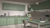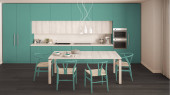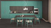 Zdjęcie "Przytulny turkusowy i drewniana kuchnia i jadalnia w nowoczesnym apartamencie, stół z krzesłami. Szafki i półki z garnkami, patelniami i sprzętem. Parkiet, pomysł na wystrój wnętrz" może być wykorzystywane do celów osobistych i komercyjnych zgodnie z warunkami zakupionej licencji Royalty-free. Obraz jest dostępny do pobrania w jakości wysokiej rozdzielczości do 5760x3840.