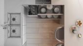 Szara i drewniana kuchnia zamyka się otwartymi szufladami z talerzami, garnkami, butelkami, drewnianymi łyżkami i akcesoriami. Zlewozmywak, płyta indukcyjna z patelnią. Widok z góry, plan, powyżej, wystrój wnętrz