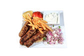 Widok z góry grillowane klopsiki, bulgur pilaf, pieczone pomidory i papryka podawane na białym talerzu
