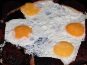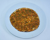 Zamknąć bekon, kiełbasę z jajkami w zapiekance. Tradycyjna kuchnia turecka. Makro.