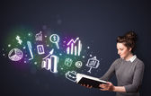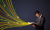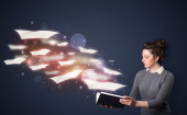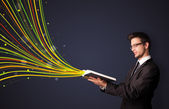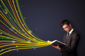 bardzo młoda kobieta, czytanie książki, podczas gdy kolorowe linie są comin