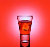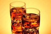 Szklankę whisky i lodu na żółtym tle. Rozrzucony lód i powoli topniejący. Świeża młoda whisky