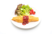 Widok z góry omlet grzybowy z kiełbasą serwowane z ogórkiem i pomidorem