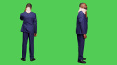 blondynka i młody afrykański biznesmen w garniturze pozowanie izolowany na szary, sztandar