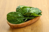 Świeże zielone liście szpinaku w misce na drewnianym tle