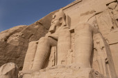 Kolumny i posągi na dziedzińcu Ramzesa II świątyni Luxor. Luxor (zniszczone Teby). Stany Zjednoczone.