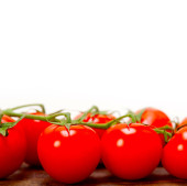 świeże pomidory wiśniowe na klastrze nad wiejskim drewnianym stołem