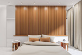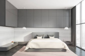 Zdjęcie "Ciemne wnętrze sypialni z pustym białym plakatem, łóżko, panoramiczne okno, fotel, drewniana ścianka działowa, betonowa podłoga i łóżko. Koncepcja współczesnego projektowania apartamentów. Szykuj się. 3d renderowanie" może być wykorzystywane do celów osobistych i komercyjnych zgodnie z warunkami zakupionej licencji Royalty-free. Obraz jest dostępny do pobrania w jakości wysokiej rozdzielczości do 5760x3840.