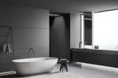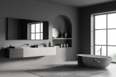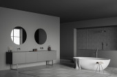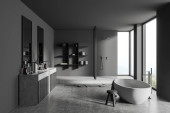 Nowoczesne wnętrze łazienki z wanną ceramiczną, podwójnym zlewem, lustrem, prysznicem. Szare ściany, betonowa podłoga. Panoramiczne okno. 3d renderowanie.