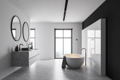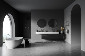 Zdjęcie "Nowoczesne wnętrze łazienki z wanną ceramiczną, podwójnym zlewem, lustrem, prysznicem. Szare ściany, betonowa podłoga. Panoramiczne okno. 3d renderowanie." może być wykorzystywane do celów osobistych i komercyjnych zgodnie z warunkami zakupionej licencji Royalty-free. Obraz jest dostępny do pobrania w jakości wysokiej rozdzielczości do 5760x3840.