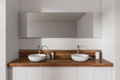 Zdjęcie "Jasne wnętrze łazienki z dwoma umywalkami, lustro z odbiciem, białe ściany, dębowa drewniana podłoga, półka z ręcznikami. Koncepcja higieny i zabiegów uzdrowiskowych dla zdrowia. 3d renderowanie" może być wykorzystywane do celów osobistych i komercyjnych zgodnie z warunkami zakupionej licencji Royalty-free. Obraz jest dostępny do pobrania w jakości wysokiej rozdzielczości do 5760x3840.