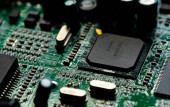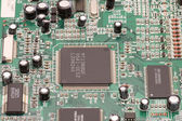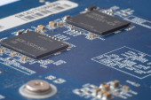 Moduł SSD w formacie M.2 zainstalowany w gnieździe na płycie głównej komputera. Zbliżenie obwodu elektronicznego z chipami pamięci i komponentami SMD