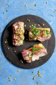 Zdjęcie "Włoska przystawka mięsna z cienkich plasterków surowej wędzonej wołowiny lub indyka. Poziomy na czarnym tle, z przestrzenią do kopiowania" może być wykorzystywane do celów osobistych i komercyjnych zgodnie z warunkami zakupionej licencji Royalty-free. Obraz jest dostępny do pobrania w jakości wysokiej rozdzielczości do 5760x3840.