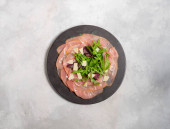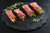 Włoska przystawka mięsna z cienkich plasterków surowej wędzonej wołowiny lub indyka. Poziomy na czarnym tle, z przestrzenią do kopiowania