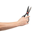 Nożyczki w ręku kobiety rasy kaukaskiej. Izolat biały.