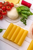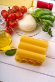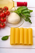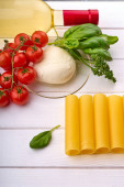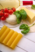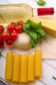 Butelka z winem, pomidorami wiśniowymi, mozzarellą, oliwą z oliwek, cannelloni i bazylią na białym drewnianym stole.