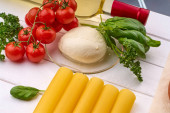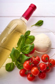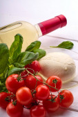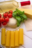 Butelka z winem, pomidorami wiśniowymi, mozzarellą, serem, cannelloni na białym drewnianym stole.