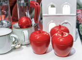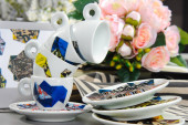 Drewniana dłoń z czerwonymi gerbery na stole z uchwytami na kubki i serwetki.