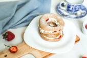 Estetyczne śniadanie camembert, bruschetta z serem śmietankowym i malinami na drewnianej desce