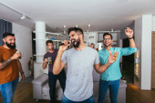 Przystojny młody facet śpiewający z mikrofonem, grający w karaoke z przyjaciółmi w nowoczesnym mieszkaniu