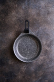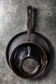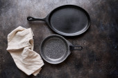 Dwie puste patelnie z bliska, widok z góry, miejsce na tekst
