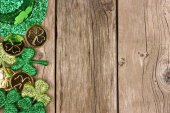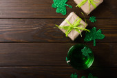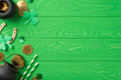 Widok z góry zdjęcie ładnych irlandzkich okularów z kapeluszami czarny dwóch meloników i dużo monet wewnątrz i wokół nich miękkie konfetti w kształcie koniczyny i jedwabnego łuku nad zielonym tle copyspace