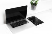 Zdjęcie "Laptop, kubek, bezprzewodowe słuchawki na białym stole. Miejsce pracy wolnego strzelca " może być wykorzystywane do celów osobistych i komercyjnych zgodnie z warunkami zakupionej licencji Royalty-free. Obraz jest dostępny do pobrania w jakości wysokiej rozdzielczości do 5760x3840.