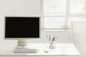 Laptop, kubek, bezprzewodowe słuchawki na białym stole. Miejsce pracy wolnego strzelca