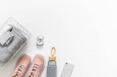 Top view kobieta ręce starannie wprowadzenie osobistych akcesoriów do wygodnego wyjmowanego organizatora filcu