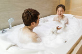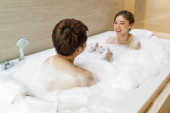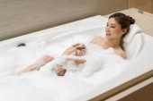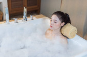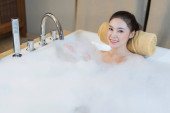 młoda kobieta relaksuje się i bierze kąpiel bąbelkową w wannie z pianką