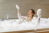 młoda kobieta relaksuje się i bierze kąpiel bąbelkową w wannie z pianką