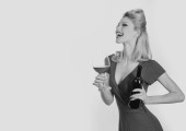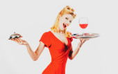 Kobieta z czerwonym winem. Prezentacja alkoholu. Przypnij kelnera winem i tacą na usługi. Restauracja serwuje. Studio odizolowany portret.