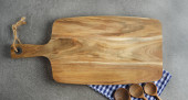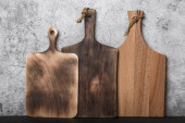 Przybory kuchenne, sztućce, naczynia, drewniane deski do krojenia na białej ceglanej ścianie widok z przodu