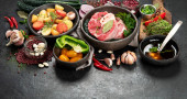 Zdjęcie "Jedzenie na ciemnym tle. Koncepcja gotowania. przestrzeń kopiowania" może być wykorzystywane do celów osobistych i komercyjnych zgodnie z warunkami zakupionej licencji Royalty-free. Obraz jest dostępny do pobrania w jakości wysokiej rozdzielczości do 5760x3840.