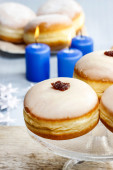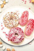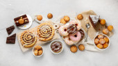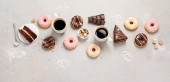 Asortyment deserów na jasnym tle. Świeżo upieczona piekarnia i przysmaki. Płaskie ułożenie, widok z góry, przestrzeń do kopiowania