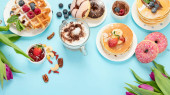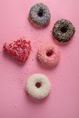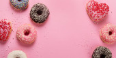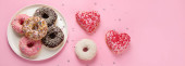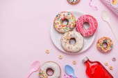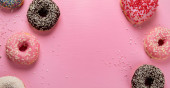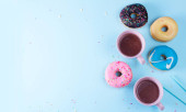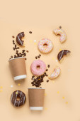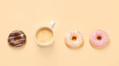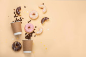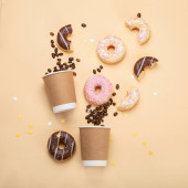 Pączki z kawą na żółtym tle. Piekarnia, koncepcja pieczenia. Płaskie ułożenie, widok z góry, przestrzeń do kopiowania